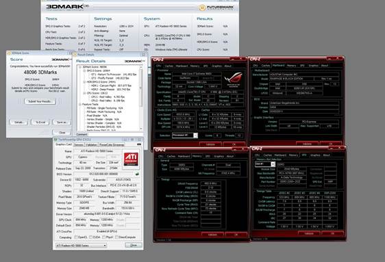 La plataforma usada fue: Un intel core i7 990X Extreme Edition 6 núcleos/ 12 threads, con una increíble frecuencia de 6.553MHz. La CPU fue montada en la nueva ASUS rampage III Black Edition, actual contendiente por ser la mejor placa madre de overclock 1366 con la Gigabyte X58A-OC. 4GB de memoias (quias el triple channel no andaba bien o es un truco del overclocker) y una fuente Antec HCP1200w. Pero claro que nos falta lo más importante las VGAs, que fueron sorprendentemente  (para quienes esperaban un QUad SLI de GTX580) 4 x ASUS matrix 5870 a 894Mhz en Quad-crossfire.