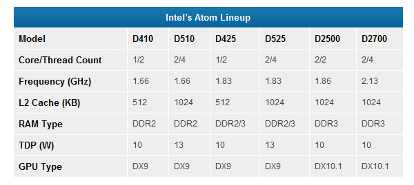 Intel ATOM es un procesador de bajo consumo, reducido tamaño, bajo costo y fabricado con el propósito de servir en portátiles como netbooks y más recientemente en tablets. Esta nueva generación tendrá vida, aunque algo tarde, a fines del 2011. Su mayor cambio será pasar de los 45nm a 32nm de fabricación, con lo que se pretende aumentar la frecuencia final tanto de CPU como de GPU integrada. Esto debido a que Intel no realizará mayores cambios en la arquitectura actual. Habrá por ahora solo dos modelos, el D2500 y el D2700, diferenciándose estos en su capacidad de hyperthreading y velocidad final para el modelo más alto. El D2700 contará con una frecuencia final de 2.13GHz con 2 núcleos y 4 threads, mientras que el D2500 vendrá a 1.86GHz y solo 2 núcleos y 2 threads. Ambos modelos contará con soporte para memorias DDR3, cache L2 de 1MB, TDP 10W, gráficos capaces de correr DX10.1 y mismo chipset NM10 actual. Se espera que sus gráficos se incrementen en velocidad y en el mejor de los casos pase a ser un HD Graphics recortada, de los CPUs Arrendale.