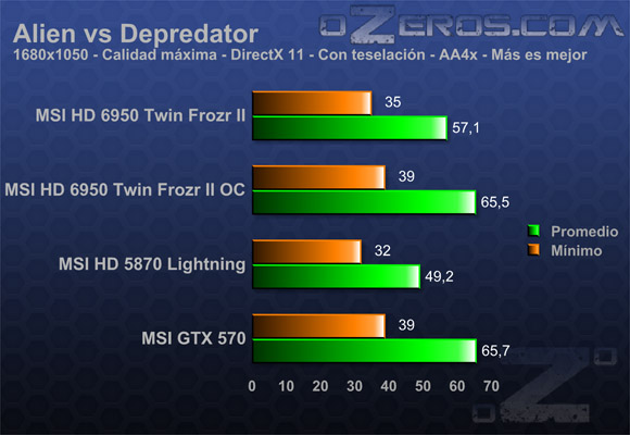 Acá se nota el aumento de rendimiento bajo DirectX 11 de Cayman, y en el caso de la tarjeta stock y overclock, los resultados son realmente buenos.