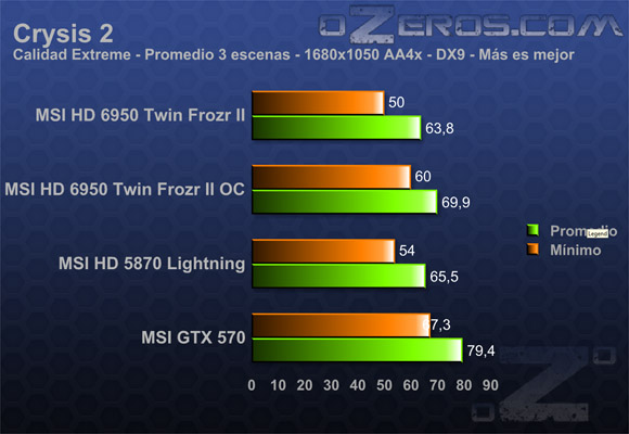 Con la configuración de fabrica logramos sobrepasar los 60 FPS de promedio a 1680×1050, y en resolución Full HD quedamos por debajo de este estándar pero de todas manera, muy cerca. Bajo overclock tenemos un gran salto de rendimiento y podemos saborear los 60 FPS en ambos casos de resolución. Además, con overclock logramos un poco de estabilidad en la pérdida de FPS cuando subimos la reslución, comparada con la HD 5870.