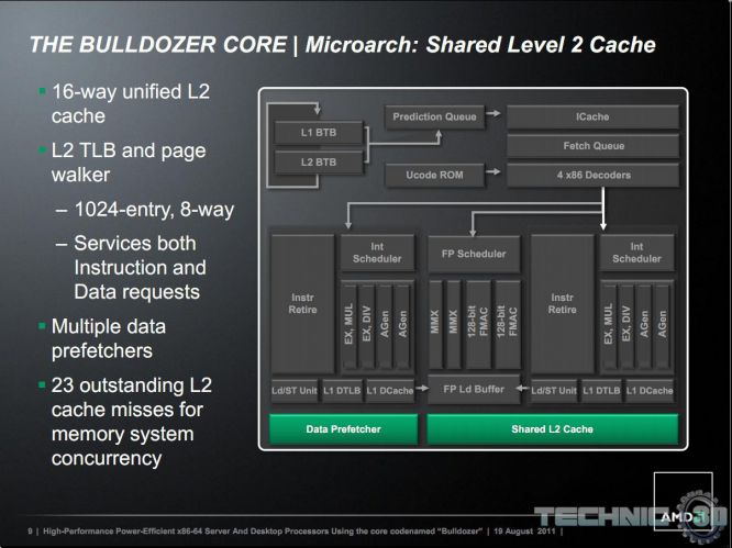 Despues de finalizada la Hot chip, Charlie Demerjian de Semiaccurate se hizo con la imagen exclusiva del die de un chip AMD bulldozer, donde se revelan todas las partes que contiene su núcleo. Pero eso era algo ya muy sabido y que AMD ha venido desvelando de a poco este último tiempo. Lo más importante de esta imagen es que indica la cantidad exacta del tamaño del chip, unos 315mm2, tamaño que se acerca a lo dicho por John Fruehe tiempo atrás, donde indicaba que el tamaño rondaría los 300mm2. Este tamaño es menor a los 346mm2 que poseía AMD thuban de 6 núcleos, pero aun es mucho mayor a un Intel Sandy Bridge de 4 cores (216mm2) y a un Intel Westmere de 6 cores (239mm2). Lo que si suma es que AMD ha logrado lo que se propuso con el nuevo núcleo de Bulldozer, contener más núcleos en un menor espacio. Aun así queda la duda en que tipo de artimañas estará logrando AMD para sacarle mejor provecho a los costos de producción de su chip Bulldozer, frente a los costos de Intel los que claramente siguen siendo menores en esta confrontación.