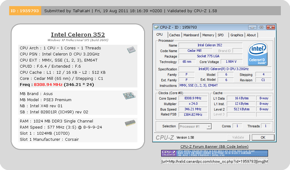 La hazaña fue realizada por ‘TaPaKaH’, overclockero extremo de Letonia, quien haciendo uso de un Celeron D 352 (3,2 GHz de fábrica), una placa madre ASUS P5E3 Premium (X48), 1 GB de RAM Corsair y litros y litros de nitrógeno líquido, logró la impresionante suma de 8.308,9 MHz (casi 160% de overclock).