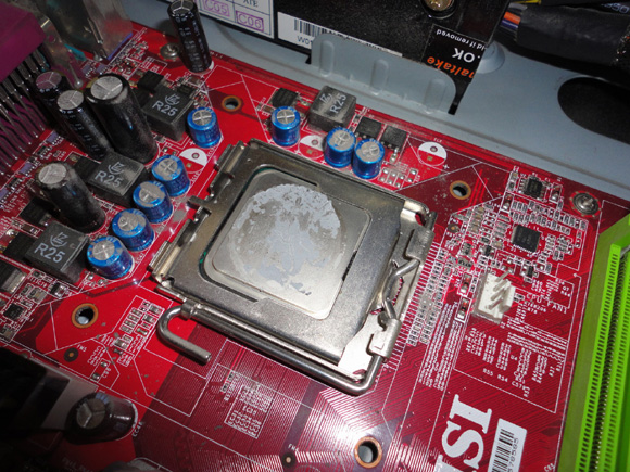 Untamos unos cotonitos o algún paño con un poco de alcohol y limpiamos la superficie de nuetro CPU (lo mismo para la base del disipador). Quedará similar a esto: