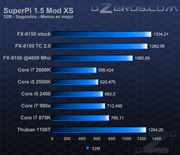 Si los gráficos no tuviesen números diríamos que son iguales, esto pasa simplemente por el comportamiento lineal de los resultados. Ajeno a eso, tenemos un FX-8150 bastante alejado de los resultados de Sandy Bridge, como siempre se ha visto en la eterna batalla épica de AMD versus Intel en Super PI. Sin embargo, lo más que podría extrañar es que el resultado no es mejor que el de un Thuban 1100T, que funciona por defecto a menor frecuencia que el procesador que revisamos hoy día.