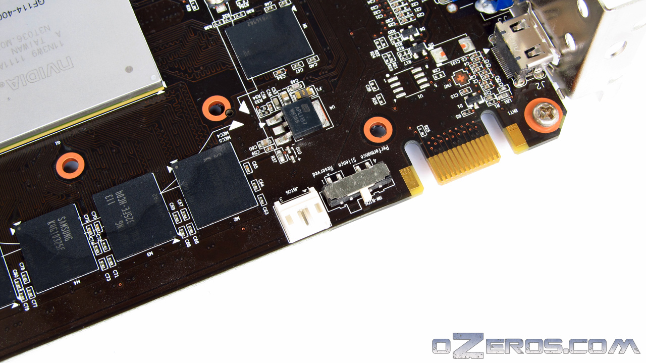 En uno de los extremos de esta tarjeta nos contramos con un header de 4 pines para conectar los ventiladores del sistema Twin Frozr III, a su lado, los 3 puertos para testear voltajes; de arriba a abajo: GPU, memorias y PLL.