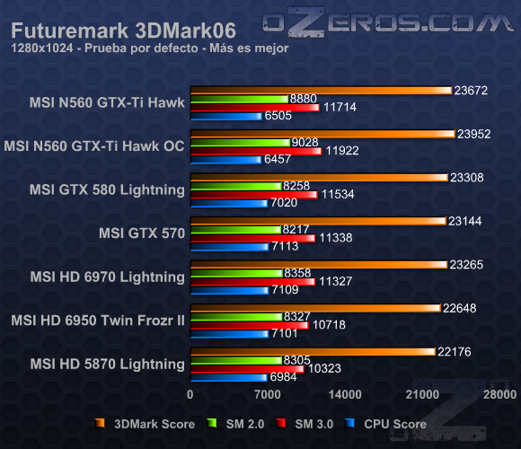 Para 3DMark 2006 logramos un excelente puntaje posicionando a la N560GTX-Ti por encima de la GTX570 e incluso de la GTX580, posiblemente por un cuello de botella a estas dos últimas VGA’s. Con overclock algo mejora el asunto, pero no mucho y debido al mismo efecto explicando antes.