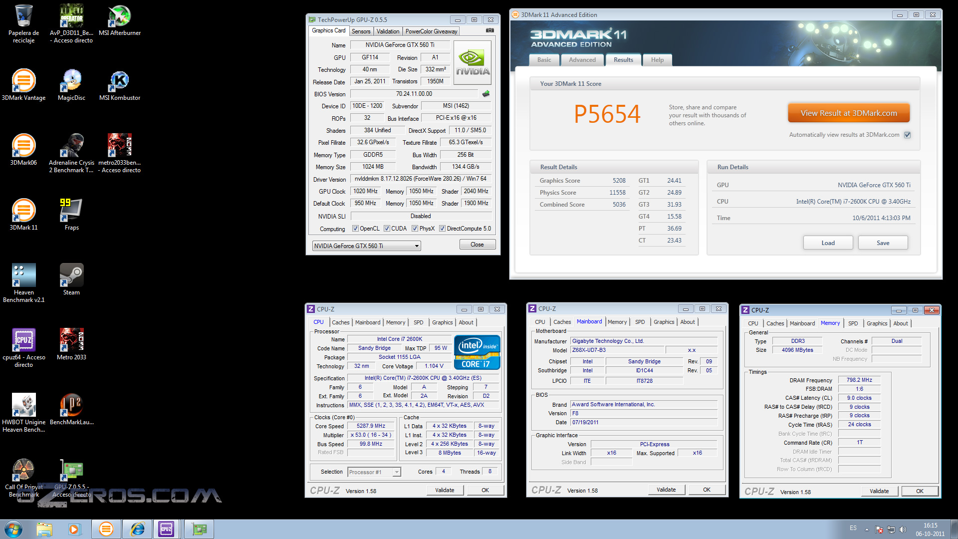 | Pruebas sintéticas | Futuremark 3DMark 2006 Futuremark 3DMark Vantage Futuremark 3DMark 11 Unigine Heaven HWBot Edition |
