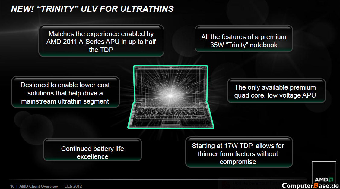 También salen a relucir nuevamente las capacidades de bajo consumo de una versión de 17W basado en Trinity. Un APU totalmente diseñado para notebook ultra delgados o mejor dicho “ultrabook”.