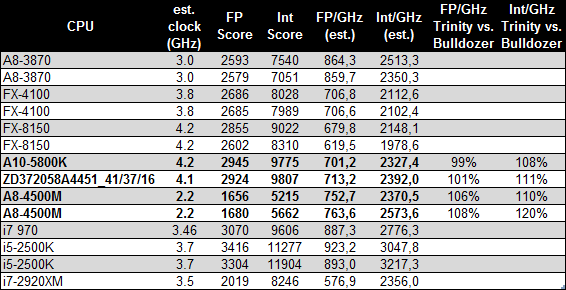 Con esto Dresdenboy no se pudo resistir a comparar los resultados entregados con diferentes modelos de CPU, entre ellos Bulldozer (FX) y el APU Llano. Además se tomo la molestia de aproximar estos resultados a un modelo real de un APU A10-5800K.