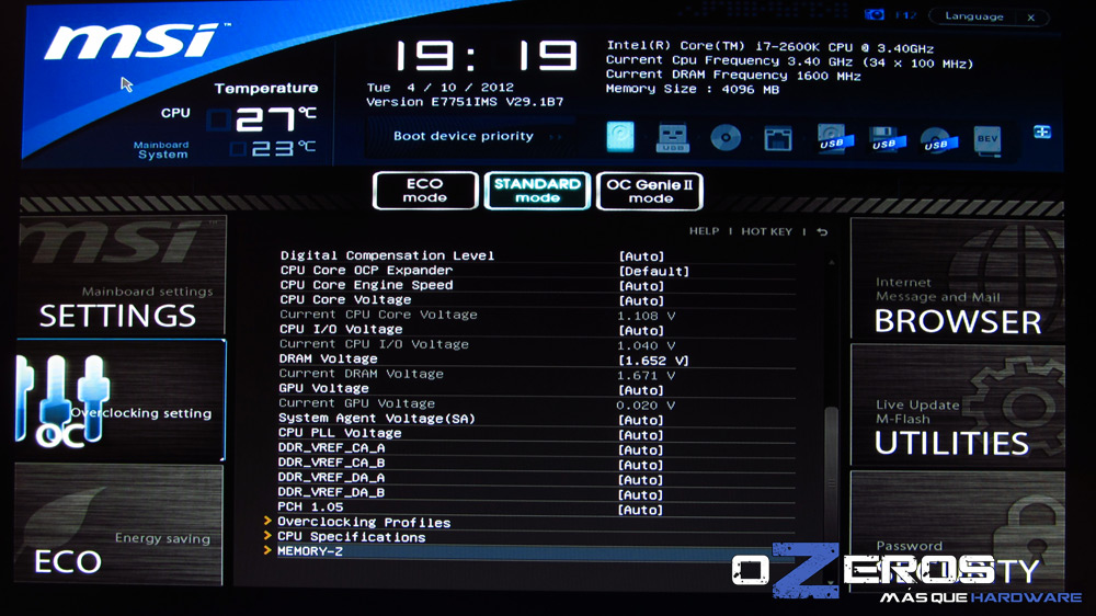 La BIOS nuevamente utiliza el sistema UEFI para tener un entorno más agradable, visual e intuitivo. Según las BIOS EFI que hemos visto hasta ahora, la de la Z77A-GD55 se ve bastante más depurada ya que al navegar entre los menús se siente más rápida, sin presentar cuelgues y con un funcionamiento más suave y preciso del mouse.