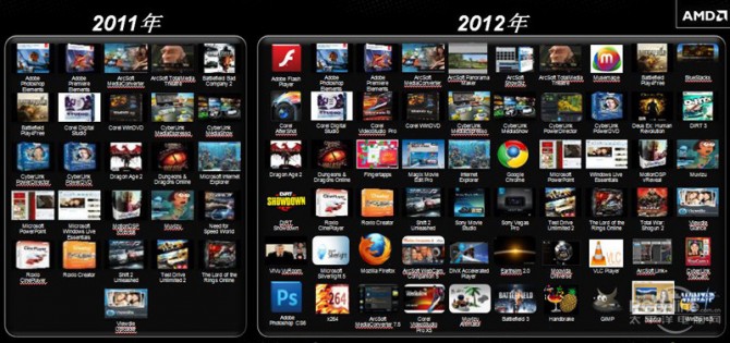 Trinity no sólo es un hardware mucho más potente que LLano, sino que también AMD ha trabajado en integrar más soporte de software. Esto queda demostrado en el siguiente gráfico, en el que claramente se nos indica que Trinity ofrecerá un mejorado soporte en juegos y aplicaciones, en cantidad, dos veces más que Llano.