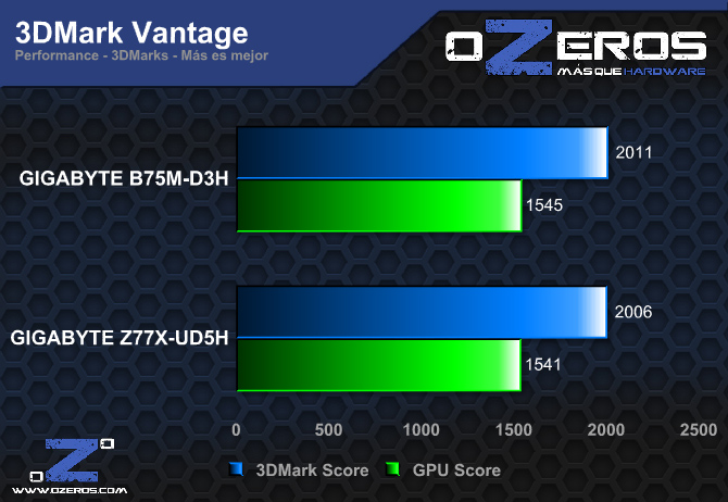 Para efectos comparativos agregaremos los resultados obtenidos con una plataforma exactamente igual, pero usando una hermana mayor de la placa en cuestión, la GIGABYTE Z77X-UD5H. El afán de esto es definir si es que existe una diferencia sustancial con una placa de rango mayor y aislar estas diferencias (si es que realmente existen).