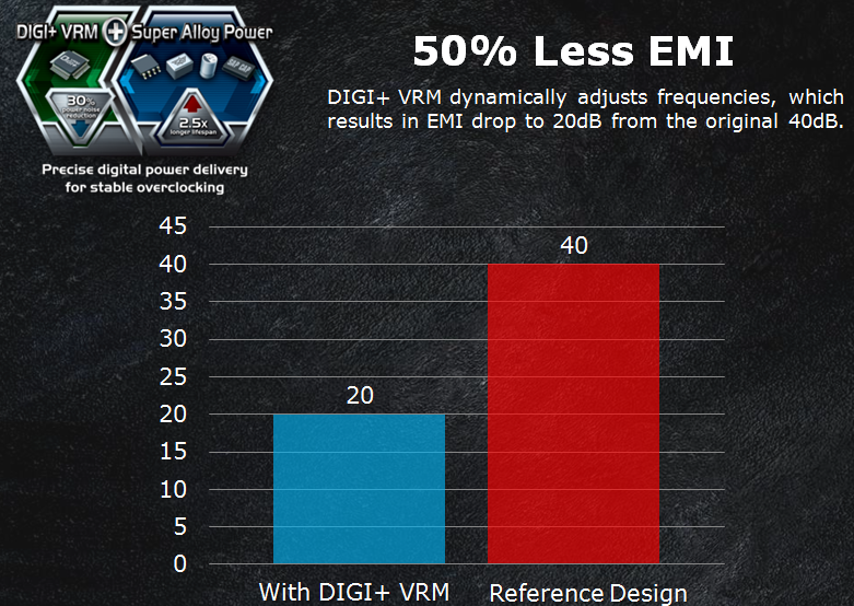 Finalmente, el sistema DIGI+ VRM reduce el un 50% las ondas de emisión “EMI”, ajustando las frecuencias según el patrón de carga y logrando una disminución de 40 dB hasta 20 dB.