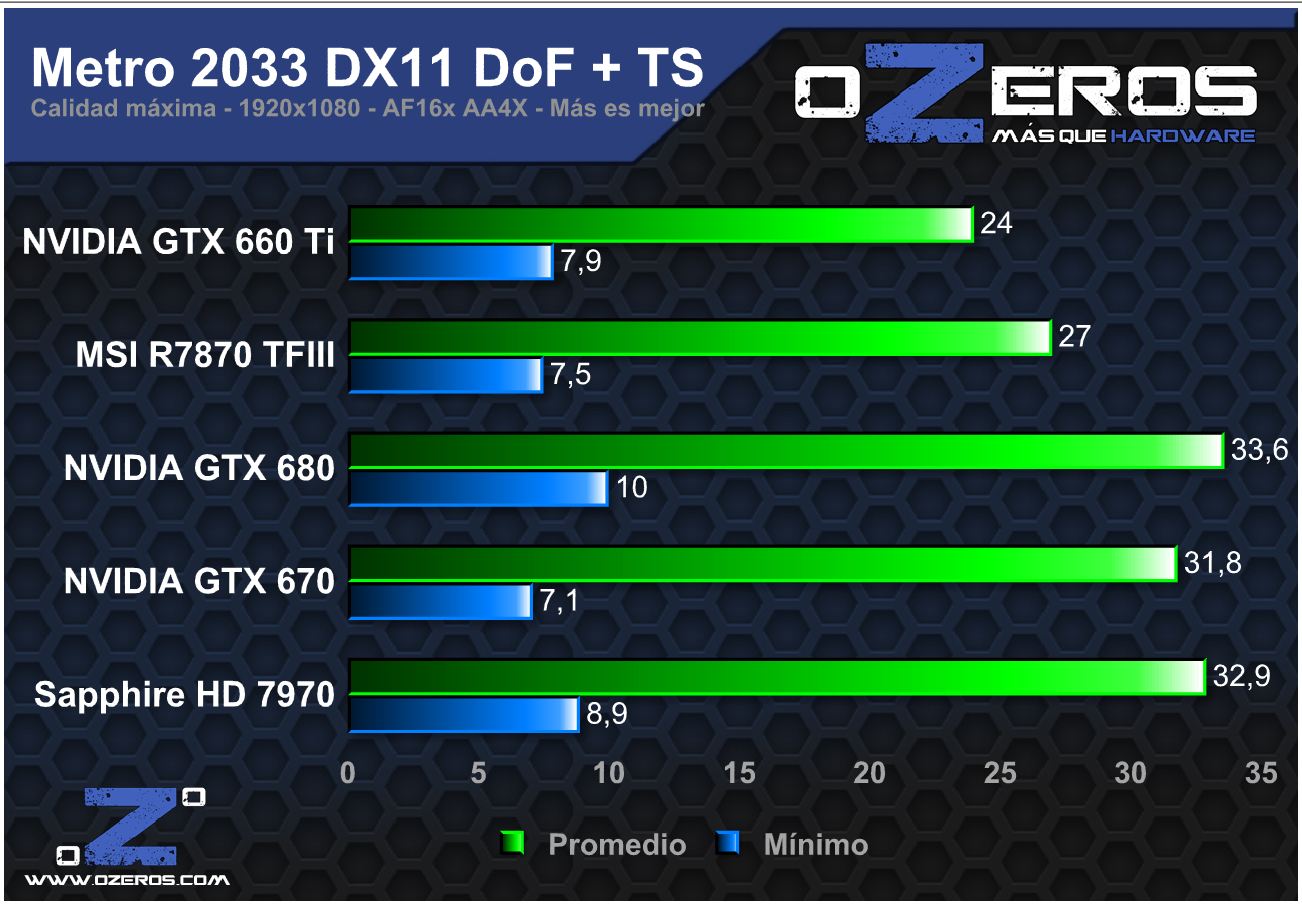 Subimos bastante el nivel con Metro 2033 y en el gráfico podemos ver que ya es bastante exigente para cualquier gráfica actual. Con sólo ver como se pegan alrededor de los 10 FPS los mínimos, da miedo. La GTX 660 Ti de igual modo se alza con un buen margen en los 30 FPS “jugables“. La avanzada no se inmuta ante esta cabezita que se asoma.