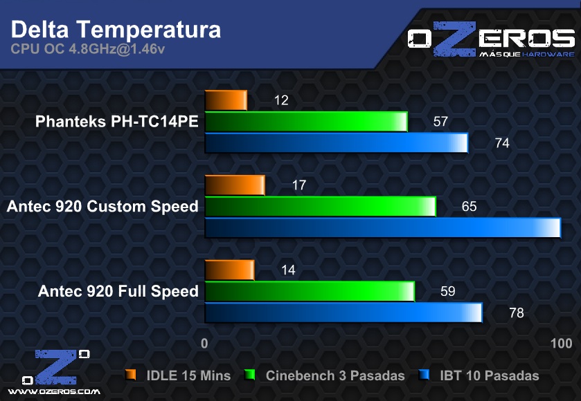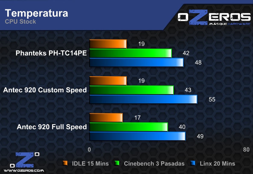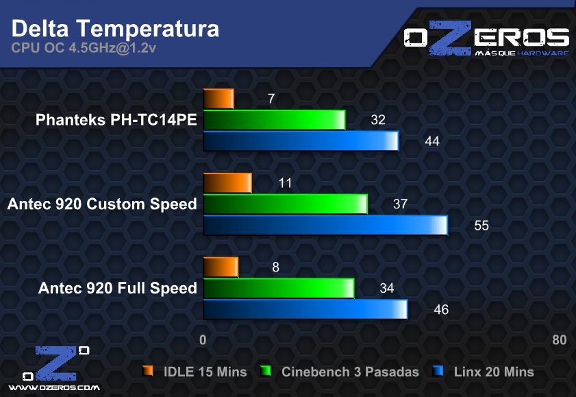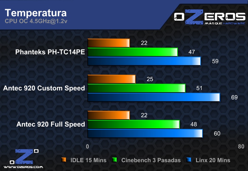 Por otro lado, el usar el Noctua de 59 CFM arrojo un resultado similar a la configuración típica del Phanteks a 2 ventiladores, mientras que el Antec de 110 CFM, funcionando a máxima velocidad por cierto, obtuvo un grado menos en IDLE y con carga.