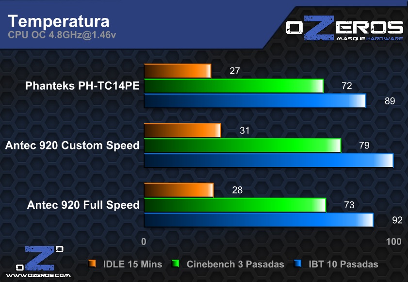 Acá simplemente las temperaturas se disparan y ninguna de las soluciones da abasto a la hora de apalear el calor generado. De todas maneras, increíblemente el Phanteks no suelta la delantera y supera al Antec en todas las pruebas, lo que demuestra la increíble capacidad de este cooler.