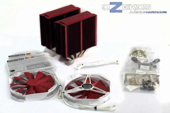 Una vez retirado, se puede apreciar el disipador, un par de ventiladores de 14 cm, cables, soportes, una pasta térmica de la marca y las instrucciones, o sea un bundle bastante completo, entre los cuales destaca un tercer juego de clips para montar otro ventilador, aparte de pads antivibraciones.