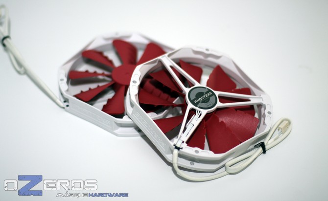 Los ventiladores que trae son simplemente hermosos, saliendo de la norma por sus colores, y ofrecen un excelente equilibrio entre rendimiento y ruido ya que son capaces de dar 88 CFM a unos muy bajos 19 dB. Uno de los grandes responsables de esto son sus aletas con diseño llamado “Maelstrom Vortex Booster”, que no hacen mas que facilitar el flujo de aire.
