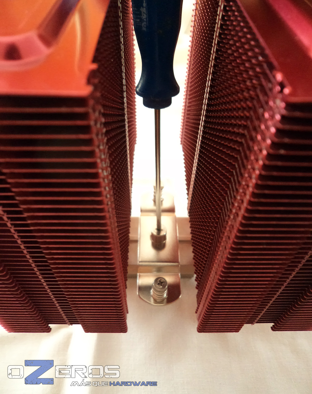 Luego sin los ventiladores, atornillamos bien lo que nos falta y estamos listos con el montaje del disipador solo. Acá está otro gran problema y es que los clips para ser anclados, deben ser doblados y son muy difíciles de colocar. Su reviewer se demoró 10 minutos en poner el primer par de clips, pero una vez que ya se conoce la técnica, se hace bastante más fácil.