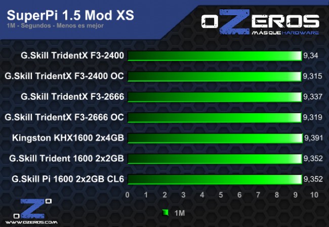 Un ajuste de cuentas acorde a la subida de frecuencias y un excelente resultado teniendo en cuenta que sólo movemos las memorias. Este mismo comportamiento se debería apreciar al aumentar la carga de trabajo, incluso, haciendo más notoria esta diferencia.