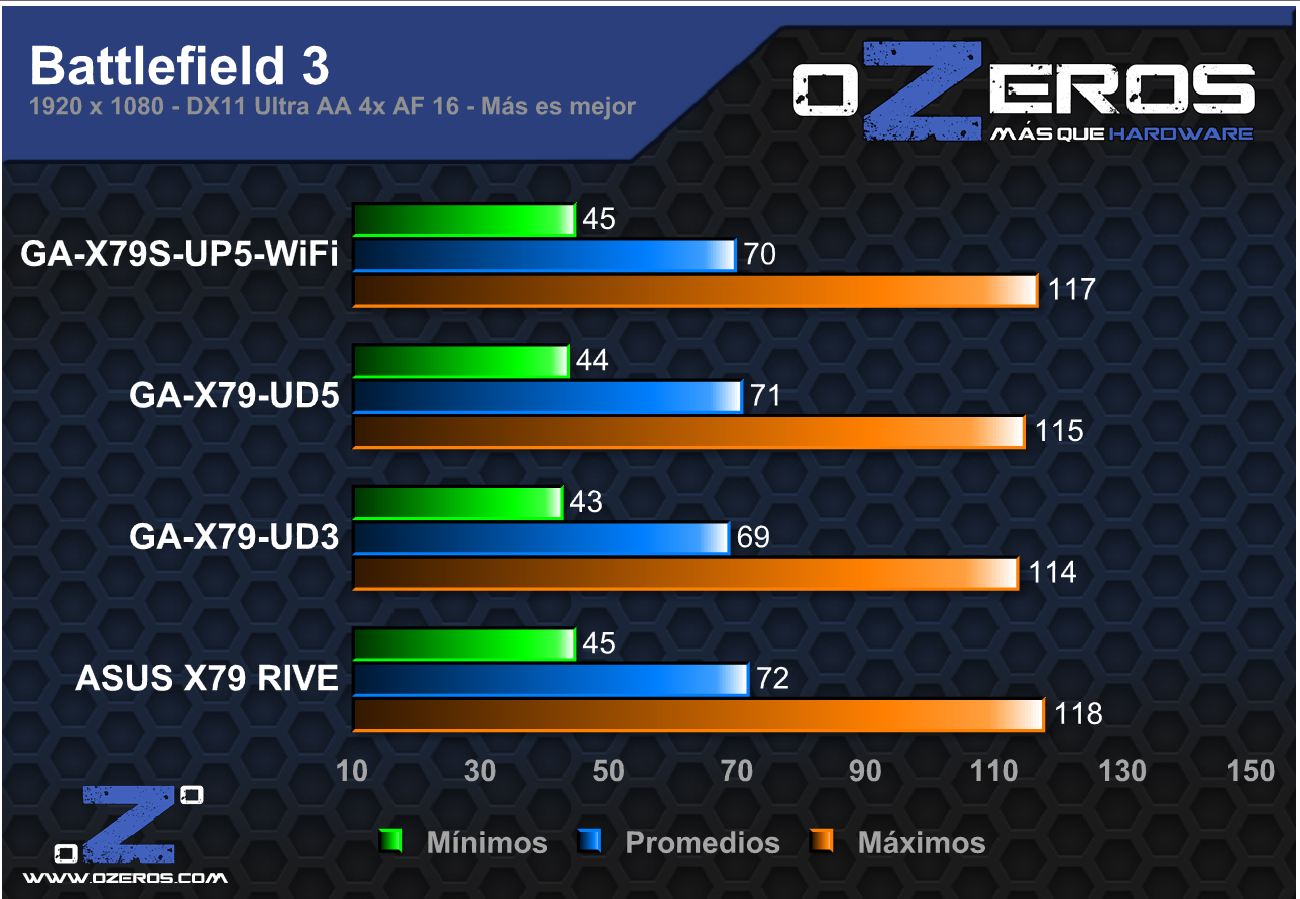 Llegamos a la prueba más dura, y entremedio de los disparos y las bombas que caen en el campo de batalla la estrella azul mantiene un buen ritmo en los mínimos, algo se aleja en los promedios pero recupera la marcha en los máximos. De todas formas, nada que nos haga pensar que una placa u otra es mejor para juegos en rendimiento bruto, antes esta la tarjeta de video y luego, en un espacio menor, la CPU.