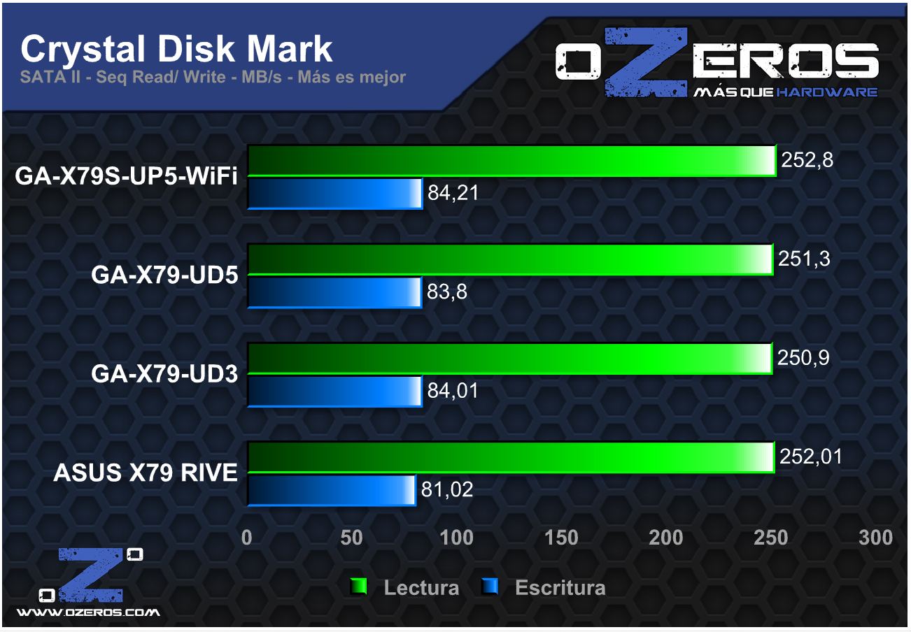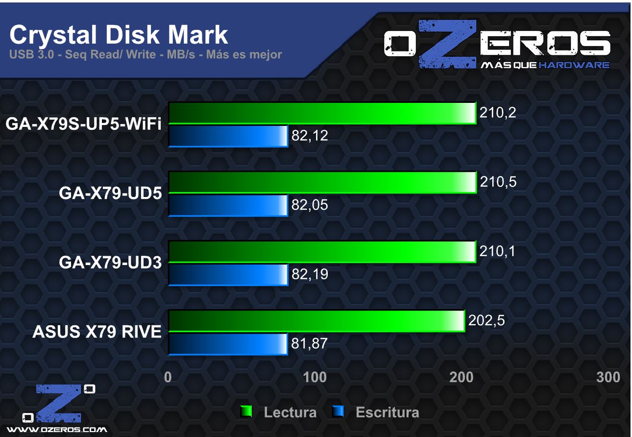 USB 2.0 ha tocado techo hace bastante tiempo, y cada fabricante hace lo suyo para tratar de mantener este rendimiento lo más al límite posible. Ambas placas X79 comparten casi los mismos números, no hay mucho que decir acá.