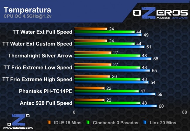 Comenzando con las pruebas, notamos que inmediatamente el Water 2.0 extreme se muestra un duro competidor, dando excelentes temperaturas tanto en su modo custom como full speed. Solo el Frio extreme logra vencerlo al momento de usar Linx, pero hay que tener en cuenta que la temperatura en las pruebas es fluctuante.