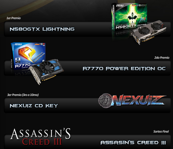 MSI te invita a un concurso de overclock en tarjetas de video MSI con soporte DX11. El concurso está ideado para competidores amateurs latinoamericanos y se utilizarán los ya conocidísimos 3Dmark01 y 3Dmark11(performance). Saca todas tus habilidades overclockeras y de optimización de software para participar para ganar una MSI N580TX Lightning entre otros increibles premios.