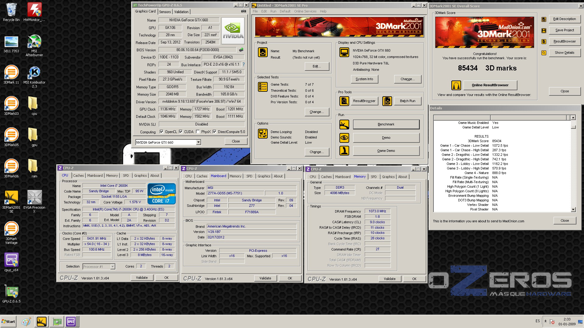 Para 3DMark 2001 SE, logramos subir +90/+900 MHz en núcleo y memorias, respectivamente, de nuestra EVGA GTX 660 SC, lo que nos permitió un puntaje final de 85.434. Puede parecer poco para una vga de esta potencia, sin embargo, recuerden que este bench ya es viejo y nuestra compañera esta enfocada en lo que es benchmarks y juegos actuales.Muchas veces nos ha sucedido, con este benchmark, que obtenemos puntajes inferiores con tarjetas más nuevas, en comparación a lo que se lograba con tarjetas de generación anterior. Es una de las características distintivas de este programa, como también lo es su dependencia a buses altos en el sistema, a frecuencias de memorias y latencias bajas. Casi tan similar como un benchmark de CPU como Super Pi.Validación