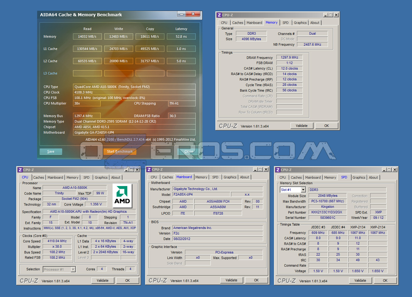 En cuanto a memorias AMD continúa avanzando en los datos que maneja la RAM DDR3. Sus APU Trinity tienen soporte para velocidades  de 1866 MHz de forma nativa y que en combinación con un pulido IMC prometen altas frecuencias (como veremos más adelante). Pero AIDA 64 no lo favorece, o no hace relucir el trabajo que AMD le ha dado a ello. Los test de escritura, lectura y copia en Trinity son mucho más bajos que los potentes traspaso de datos entre RAM e IMC de Ivy Bridge. Veremos eso si, si en la práctica esto se cumple.