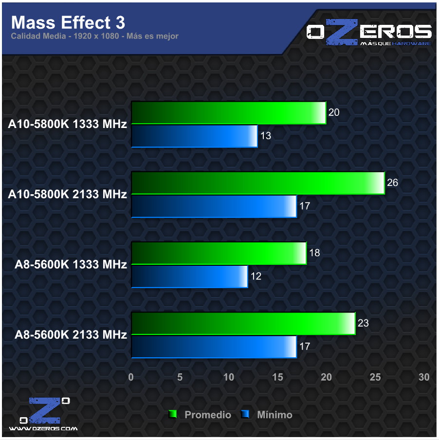 Cuando activamos una velocidad de 2133 MHz en nuestras memorias, la sopresa fue mayor al ver como los FPS llegan hasta los 10 cuaros por segundo extras. Con ello la experiencia en el juego fue notable, dejando a ambos APU en un sitial inmejorable de potencia gráfica en un GPU integrado para un exigente juego.