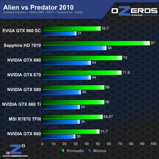 Para el caso del Alien vs Predator, la EVGA GTX 660 SC llega justo al límite de sobrepasar a su símil hecha por NVIDIA, sin embargo, no es capaz de volver a superar a la GTX 580 ni a la HD 7870, claramente por su recorte de capacidades frente a las demás soluciones.