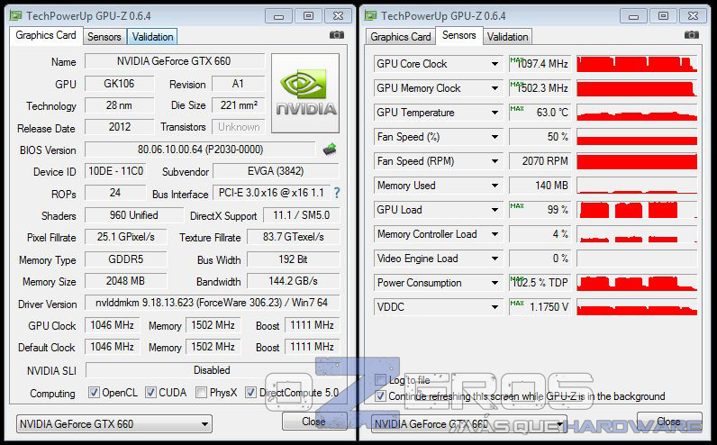 Como bien saben, el GPU Boost en las tarjetas de núcleo Kepler hace variar la frecuencia final del núcleo entregando una velocidad bastante distinta a lo que dice la caja al momento de adquirir la tarjeta. Por eso, sabemos que estos 1.111 MHz son algo similar a un “promedio” de máximas frecuencias estables y sanas, pero que en la práctica podemos tener en un momento puntual frecuencias mayores o inferiores.