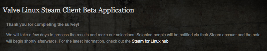 Recibiendo esta pantalla, solo hace falta esperar “pacientemente” a ver que respuesta te da la gente de Valve y ver si es que has sido aprobado como un orgulloso y tecnosensual beta tester de Steam for Linux. Nunca es una mala idea participar del proceso de depuración y busqueda de problemas de un sistema si es que se quiere optar a tener acceso a software sin fallos y también es siempre bastante interesante ser parte del desarrollo en mayor o menor escala, así que si eres linuxero, gamer y usas Steam quizás sea una buena idea y grata experiencia en la que podrías enrolarte.