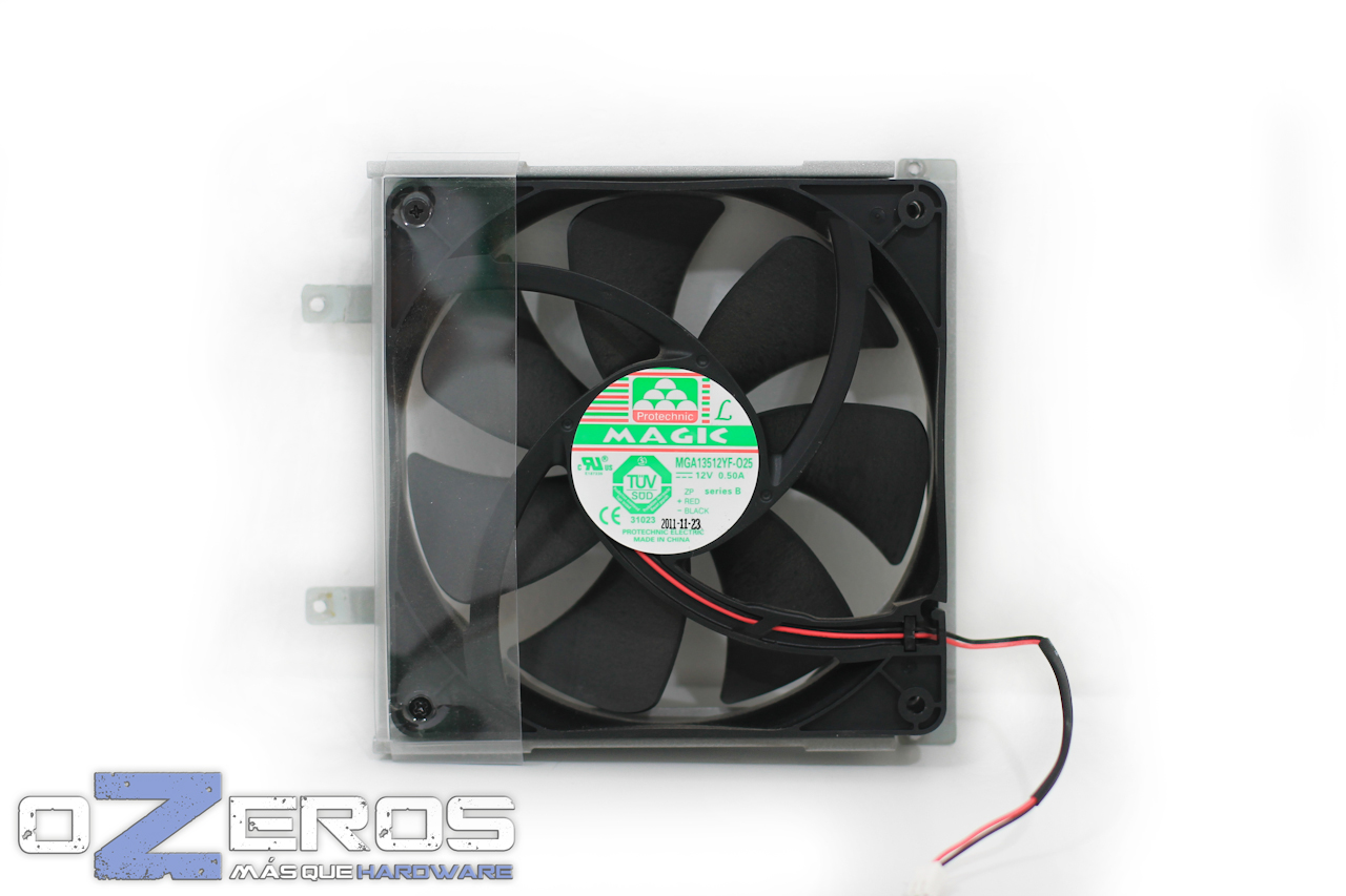 Despues de sacar la segunda tapa, nos encontramos con un ventilador MAGIC MGA13512YF-O25 de 7 aspas y un ruido máximo de 36 dBA. Este ventilador es de 12V y consume un total de 0.5A