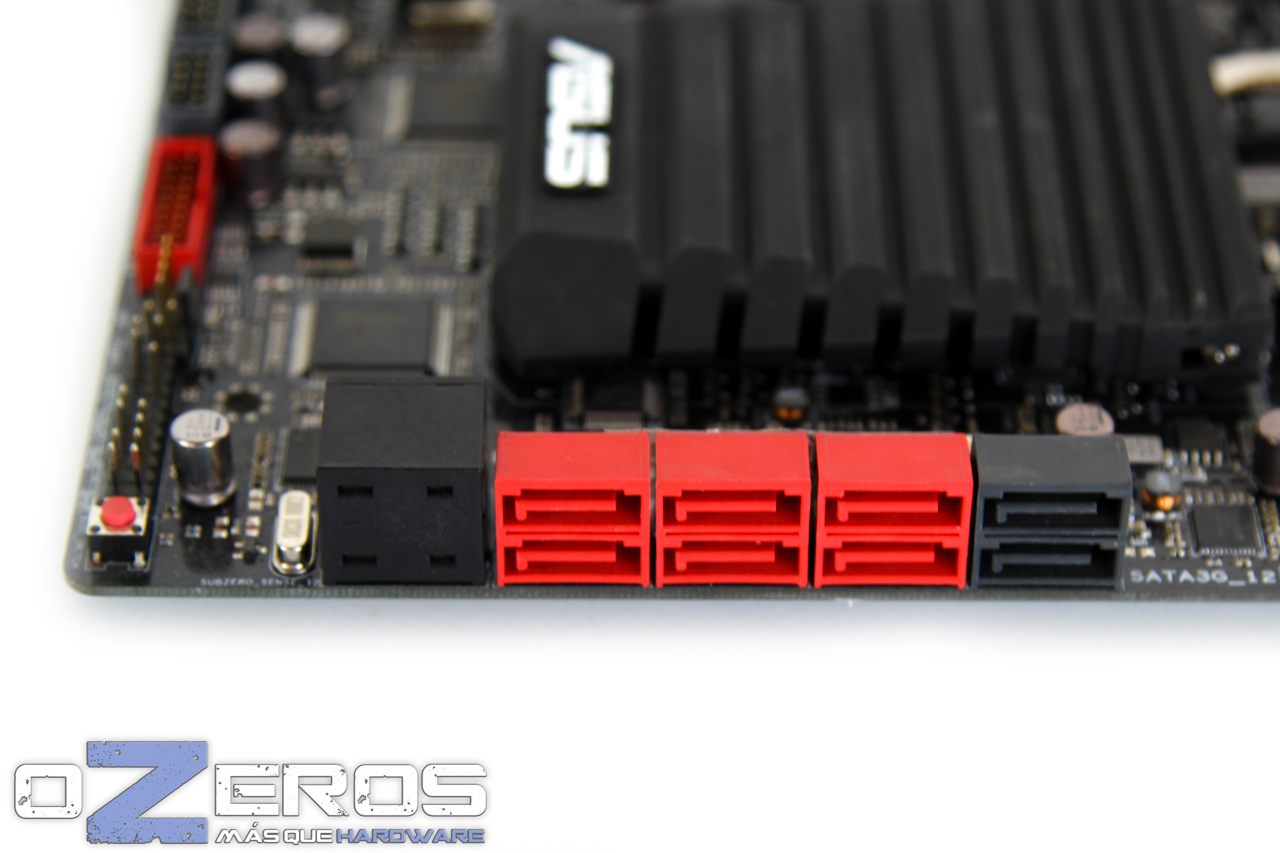 Una vista más de la gran cantidad de conectores SATA en versiones SATA III con 6 puertos y SATA II con sólo 2. Además tenemos el “subzero sense”, donde podemos colocar sondas que leen directamente la temperatura del CPU y la placa madre.