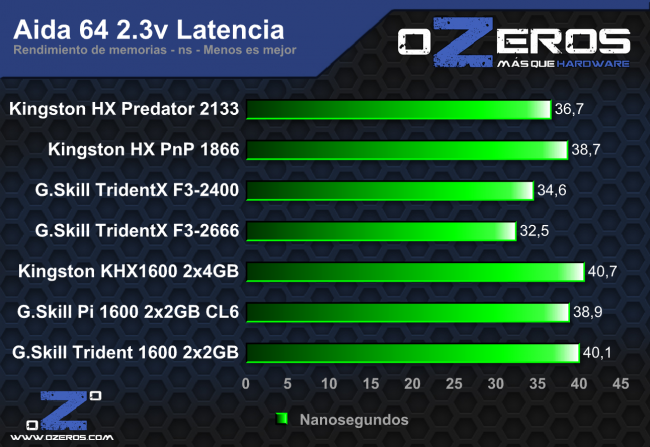 Las latencias de las Kingston HyperX Predator 2133 MHz no son muy diferentes del resto de sus contrincantes. Andan en el promedio. Si bien anteriormente vimos un buen desempeño, ahora el panorama es un poco diferente, pero no por ello es completamente desfavorable. Estos valores son fruto de las altas latencias (CL11) que tienen estas memorias sumado a una no tan alta frecuencia.