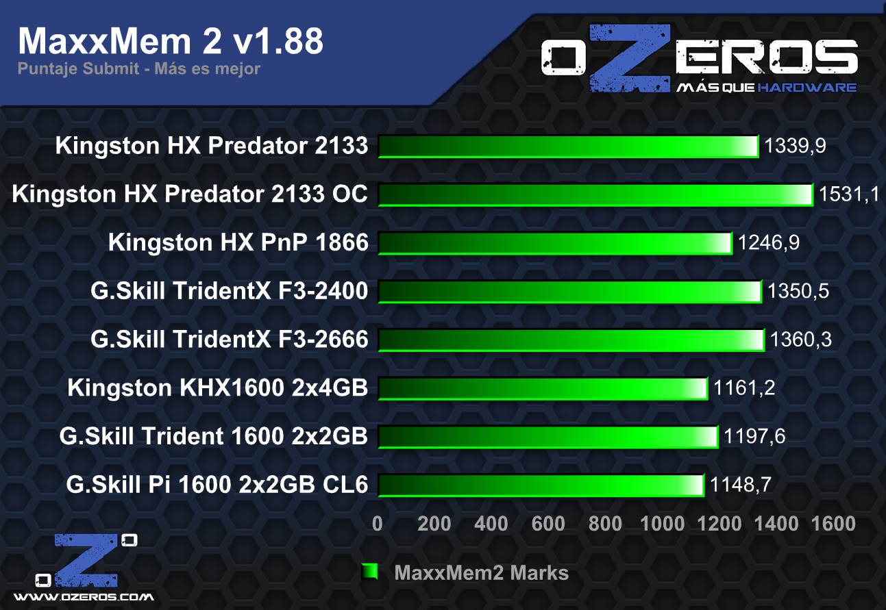 MaxxMem nos muestra valores de todo tipo. En general las HyperX Predator de 2133 MHz se mantienen en un plano favorable y rivalizan con las memorias TridentX. Se acaban las pruebas con los componentes en su configuración por defecto. Ahora se nos viene lo que le gusta a los más entusiastas: las pruebas de Overclock. Lo interesante sería presenciar si hay algún salta importante teniendo en cuenta de que estamos maximizando las capacidades de nuestro hardware. Para que podamos resolver esta interrogante los invitamos a ver los resultados en la siguiente página.