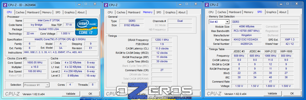 Las KHX21C11T2K2/8X constituyen un kit de memorias con 8 chips de 256 MB de DDR3 por lado (DRAM sincrónica) , los que totalizan 4 GB. Sacando los disipadores, apreciamos claramente que estos módulos están dotados con chips Hynix H5TQ2G83CFR-*xxC. Se caracterizan principalmente por ser componentes sincrónicos DDR3 y se pueden programar disitntas latencias CAS (5, 6, 7, 8, 9, 10, 11, 12 y 13). Conocer estos chips nos ayudará a configurar de mejor manera las latencias y así poder sacarle todo el rendimiento a estas memorias.