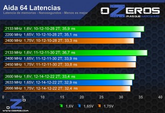 Finalizamos con la última configuración de latencias. Estas como apreciarán son muy holgadas (12-14-12-22 2T) y pudieron aguantar casi todo lo que le pudimos tirar. Como vemos, este es el caso en que el voltaje es menos dependiente y con tan sólo 1,6V superamos en frecuencias a cualquier otra configuración antes mencionada. De hecho bajo estas variables, le sacamos a las memorias stock (2133 MHz) alrededor de un 22% sin mayores esfuerzos. Con cada aumento de Voltaje, la frecuencia casi ni aumentaba y finalmente con los 1,75V se logran unos impresionantes 2666 MHz los que son un gran hito para estas memorias.