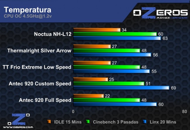 Las temperaturas se disparan, pero aun así sorprende que el Noctua sea capaz de tener temperaturas en carga similares con el Antec 920, lo que demuestra que este pequeño es capaz de batallar con los más grandes.