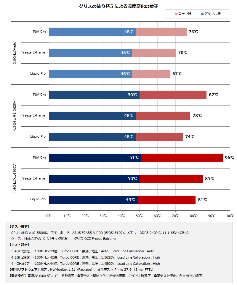 Así es, ya que AMD ha contraído este mal con sus chips Trinity, claro que las altas temperaturas no son tan evidentes hasta cuando se sobre exige al chip con unos cuantos kilos de MHz encima. Esto ha quedado al descubierto cuando los chicos de pcwatch realizaron un cambio de pasta térmica que viene de fabrica, por una de mejor reputación. Para ello no dudaron en poner en riesgo la garantía del chip, y con habilidad manual despojaron de sus ropajes a un A10-5800K para embetunarlo con dos pastas térmicas de calidad, la OCZ Freeze Extreme (La que ya no se fabrica) y la Liquid Pro.