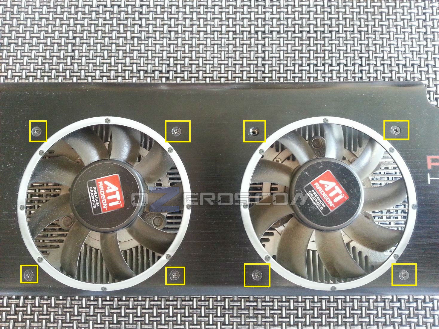 Ahora retiraremos los 8 tornillos que anclan los disipadores (con sus respectivos ventiladores) a la placa metálica con el logo de la 4850×2. Mucho ojo donde han dejado los tornillos porque estos en particular son pequeños y se pueden perder fácilmente.
