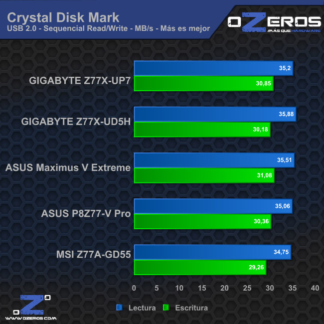 El puerto USB 2.0 se ha visto en sus límites desde hace ya varios años. Sea la placa madre que sea, no veremos más que este promedio de 35 MB/s de lectura y 30 MB/s de escritura de datos.