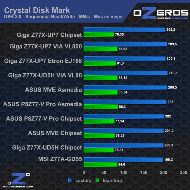 No así con el puerto USB 3.0, que puede variar claramente su rendimiento dependiendo de la controladora que se use. Así mismo, de un tiempo a esta parte nos hemos fijado que el rendimiento de puerto USB 3.0 integrado en el chipset Z77 no es de lo mejor. Esperemos que en las próximas revisiones (o en los próximos chipsets) esto se mejore.