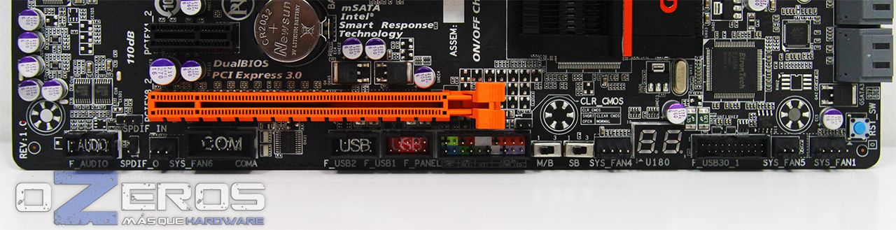 En su sona inferior tenemos todos los headers para aumentar las salidad a paneles traseros y frontales. De izquierda a derecha tenemos uno de audio (audífono y micrófono externo), un conector de 3 pines para ventilación, una salida COM, dos salidas USB 2.0 (para sumar hasta 4 puertos) mientras uno de ellos (de color rojo) está habilitado para las funciones ON/OFF Charge, dos switch para elección de BIOS, 3 conectores para ventiladores (uno de 3 pines y dos de 4 pines PWM), y entre ellos dos header para habilitar cuatro salidas USB 3.0 más.