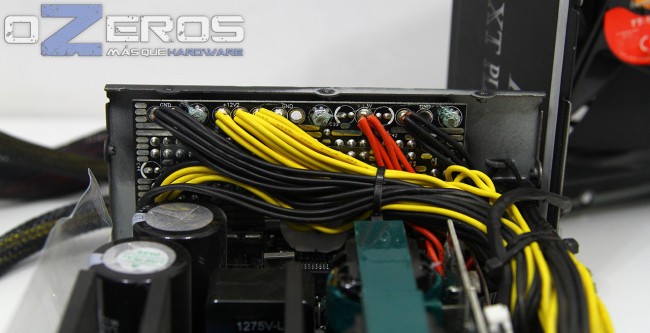 En uno de sus costados, podemos apreciar la conección entre el PCB principal, el cable de 24 pines y un PCB en la parte posterior, que es donde se ubican los conectores modulares; Al mismo tienpo se observa la conexion de los 220V de entrada.