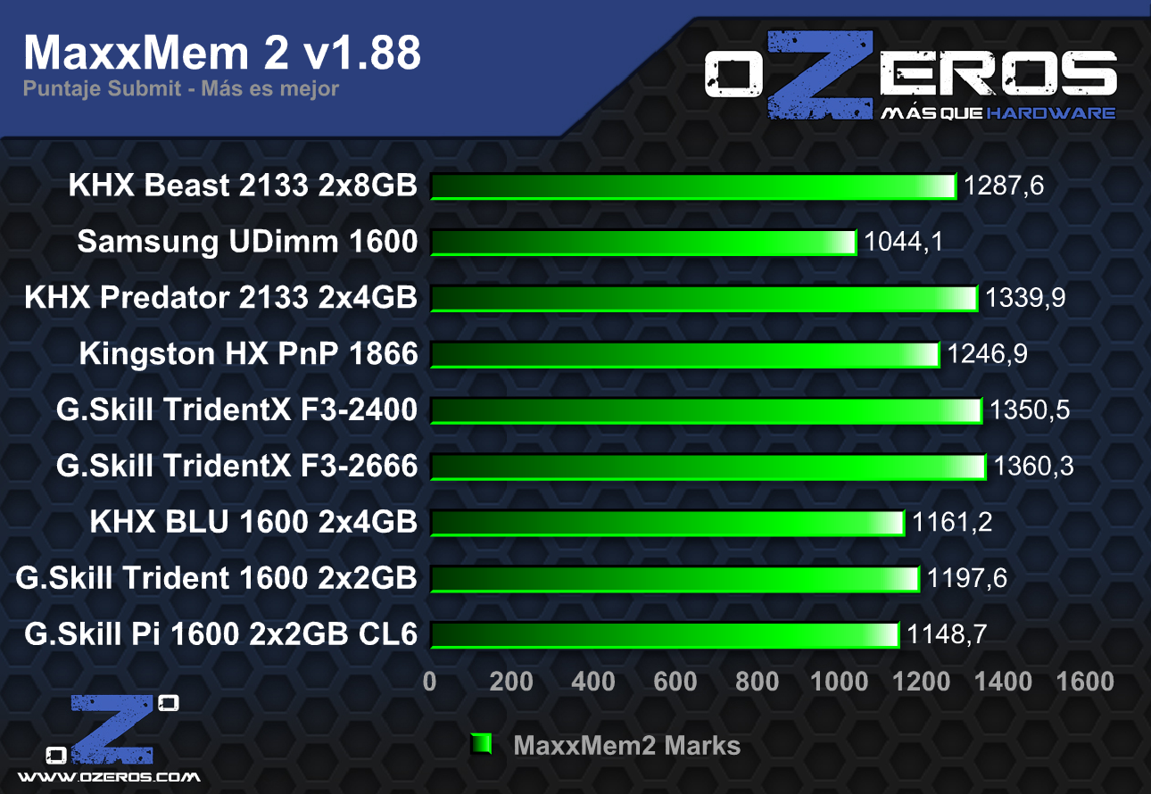 MaxMemm sin duda es el benchmark que mayor provecho le saca a las memorias dado a que nuestro puntaje creció hasta un 112%; nada de mal si lo comparamos con el resto de las pruebas antes validadas. Eso sí, aun falta ver cuanto pueden dar máximo estas memorias en condiciones ideales.