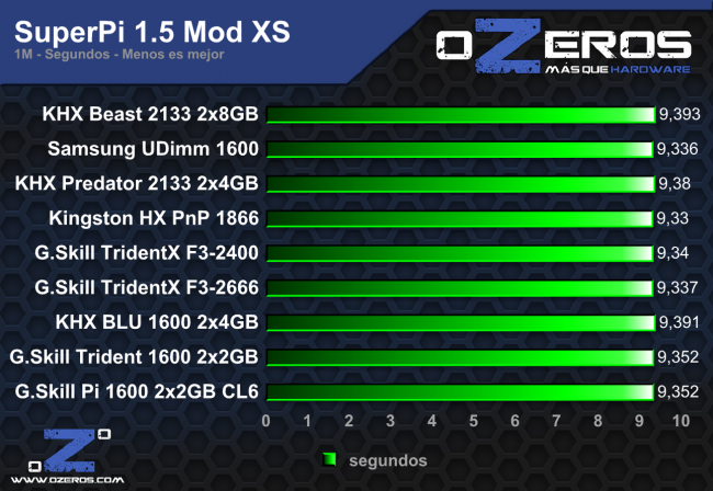 En SuperPi 1M obtuvimos un peor tiempo, lo que es muy extraño, quizás algo pasó en el inicio, pero es poca la diferencia. No es algo que nos vaya a quitar el sueño. Por el lado de SuperPi 32M si hubo mejoras, aunque no muchas. Logramos mejorar nuestro tiempo total el 7 segundos, marca que puso a las HX Beast por delante de sus competidoras.