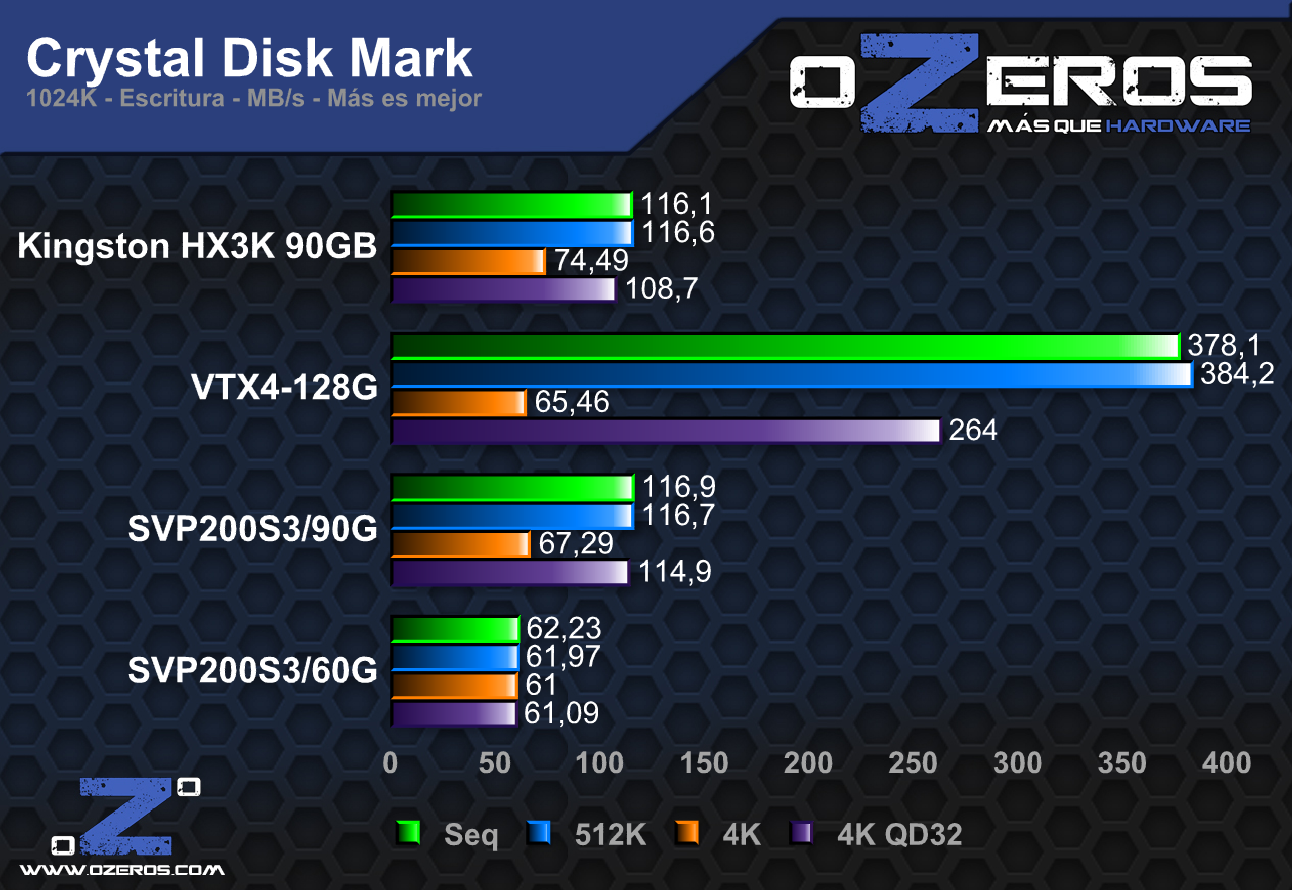 Se aprecia la misma tendencia del punto anterior al comparar las pruebas stock con las 1024K. Lo interesante es que esta tendencia se ve reflejada en todos los SSD al parecer no importando la controladora ni el tipo de memoria que posean. Ahora bien, las velocidades de escritura del KHX3K son bastante menores que la estrella de OCZ donde este último le saca más del doble de rendimiento. El Kingston HX3K mantiene resultados muy similares con el SSDNow V200+ de 90GB.